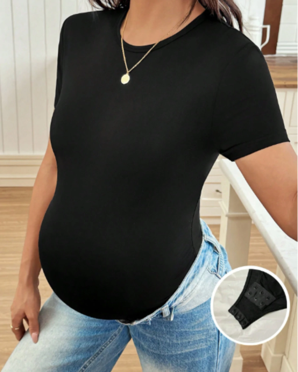 Antonella se ajusta al cuerpo con estiramiento medio que acompaña la panza sin apretar. Cuello redondo limpio, manga corta y espalda al aire para un look simple y moderno. La tela tricotada no transparenta y se siente suave todo el día. Broches inferiores para cambiar y pasar por el baño sin complicaciones. Usalo con jeans o faldas maternity, debajo de blazers o camisas abiertas. Minimal, cómodo y listo para elevar cualquier outfit.