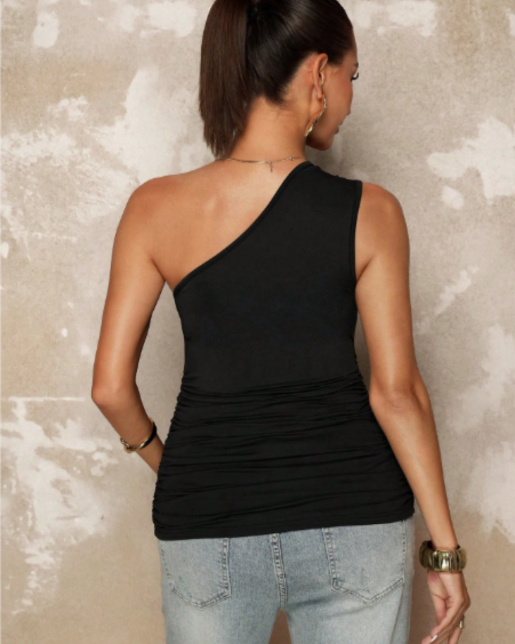 GUADALUPE eleva tus básicos de verano. Escote asimétrico que descubre un hombro, espalda al aire y frunces laterales que acompañan la panza con efecto moldeador. Calce ajustado que abraza sin apretar gracias al tricot con estiramiento medio. Largo clásico para usar por dentro o por fuera del jean maternity. Negro liso y versátil: va con faldas, shorts o sastrero. Día o noche, minimal y poderoso.